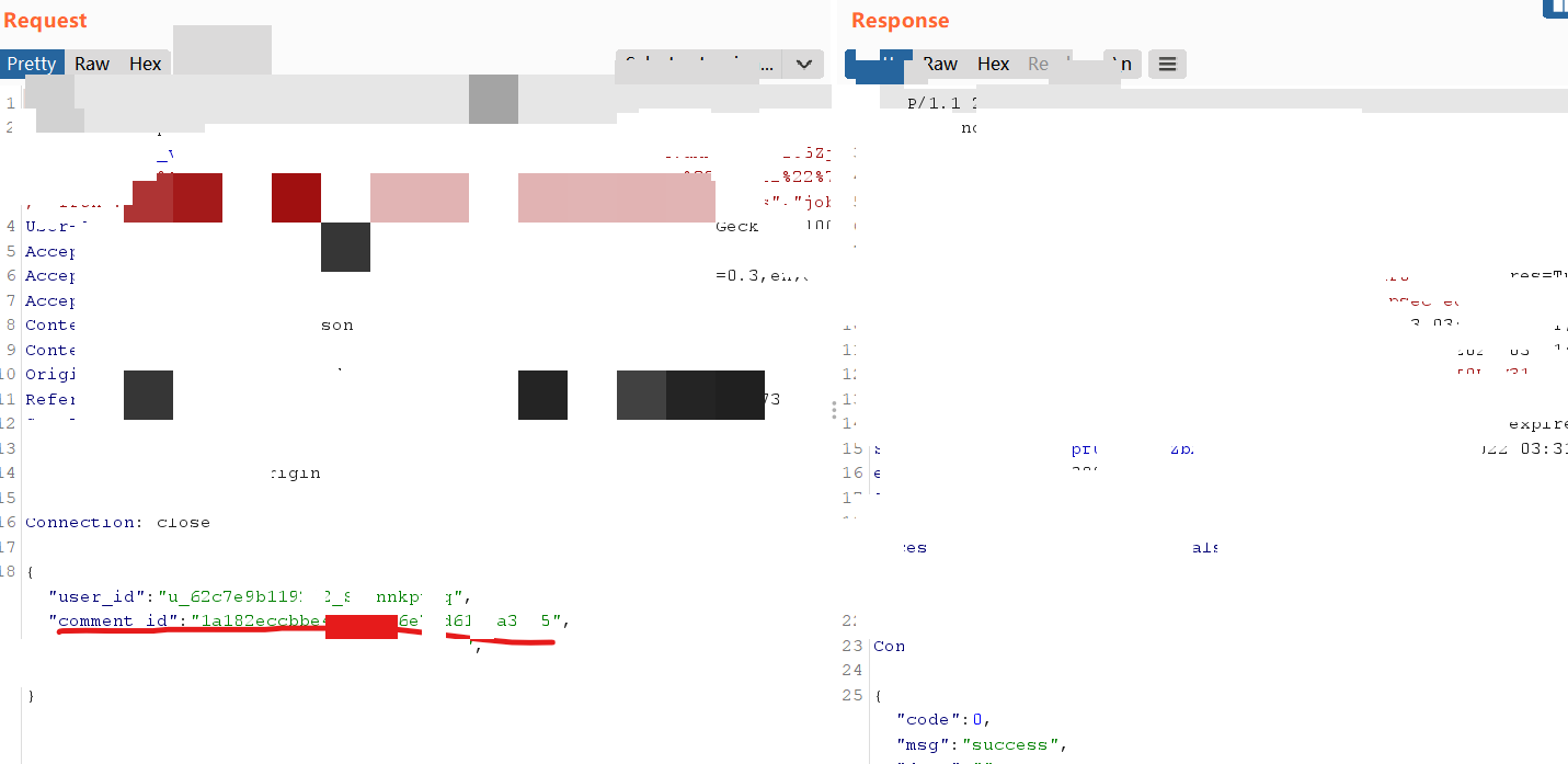 1. 在这里我们可以看到,在评论这里,有自己的发言,和别人的评论。我们点击回复,随便输入,然后点击发送,抓包,就可以看到别人的comment\_id: 2.   1. 越权撤回评论,我们在回复的时候上面还携带了:"comment\_id":"7d4fdf0cee90fdb65xxxxxxxxx",这个就是别人的内容id. 我们点击自己的评论,点击撤回,抓包  1. 我们只需要把这里的comment\_id,替换成别人的内容id,就可以造成越权撤回任意评论内容。  1. 替换成别人的id:放包,成功 2. 漏洞验证:可以看到,这里的那条评论已经撤回了。