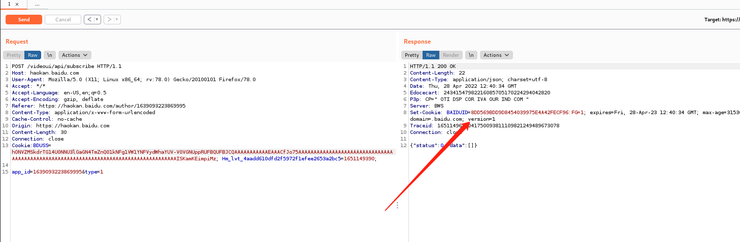 1\.以看看视频为例 <https://haokan.baidu.com/> 关注时抓包  2\.对数据包分析发现,删除数据包数据,返回不变   3\.猜测BDUSS有漏洞点  只剩下BDUSS发现返回了BAIDUID 考虑这是百度数据库的核心资产 。 4\.于是发现可以对BDUSS进行逐位爆破,就可以无限获取到百度内部数据的用户ID形成任意用户登陆。