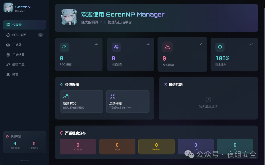 **牛逼的 POC 漏洞检测模板管理工具** 基于 Go + Wails 构建,支持 Windows、macOS、Linux 多平台 项目下载:https://github.com/InKu0721/SerenNP-manger ## 功能特性 [](https://github.com/InKu0721/SerenNP-manger#-%E5%8A%9F%E8%83%BD%E7%89%B9%E6%80%A7)  📁 **POC 模板管理** 创建、编辑、删除、导入/导出 Nuclei YAML 模板 ✏️ **可视化编辑器** Monaco 代码编辑器 + 可视化表单双模式 🎯 **漏洞扫描** 批量目标扫描,实时进度显示 📊 **结果分析** 按严重程度分类,查看请求/响应详情 🔧 **编码工具** Base64、URL、Unicode、Hex、AES、MD5、SHA 等 🎨 **现代 UI** 深色主题,流畅动画,响应式布局 * * * ## 🚀 使用指南 [](https://github.com/InKu0721/SerenNP-manger#-%E4%BD%BF%E7%94%A8%E6%8C%87%E5%8D%97) ### 1\. POC 模板管理 [](https://github.com/InKu0721/SerenNP-manger#1-poc-%E6%A8%A1%E6%9D%BF%E7%AE%A1%E7%90%86) * **新建模板**:POC 模板 → 新建 * **编辑模板**:点击模板卡片 * **导入模板**:支持导入标准 Nuclei YAML 模板 * **搜索过滤**:按名称、分类、严重程度筛选 ### 2\. 执行扫描 [](https://github.com/InKu0721/SerenNP-manger#2-%E6%89%A7%E8%A1%8C%E6%89%AB%E6%8F%8F) 1. 进入 **扫描器** 页面 2. 输入目标 URL(每行一个) 3. 选择 POC 模板 4. 点击 **启动扫描** 5. 实时查看进度和结果 ### 3\. 查看结果 [](https://github.com/InKu0721/SerenNP-manger#3-%E6%9F%A5%E7%9C%8B%E7%BB%93%E6%9E%9C) * 按严重程度过滤 * 点击 **查看 POC** 跳转模板 * 点击 **查看数据包** 显示请求/响应 ### 4\. 编码工具 [](https://github.com/InKu0721/SerenNP-manger#4-%E7%BC%96%E7%A0%81%E5%B7%A5%E5%85%B7) 支持 Base64、URL、Unicode、Hex、HTML、AES、MD5、SHA 等编解码